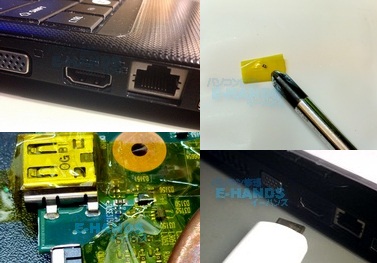 ACアダプターを接続中にコードを引っ掛けてしまい、DCジャックの真ん中のピンが折れてしまったとのことです。